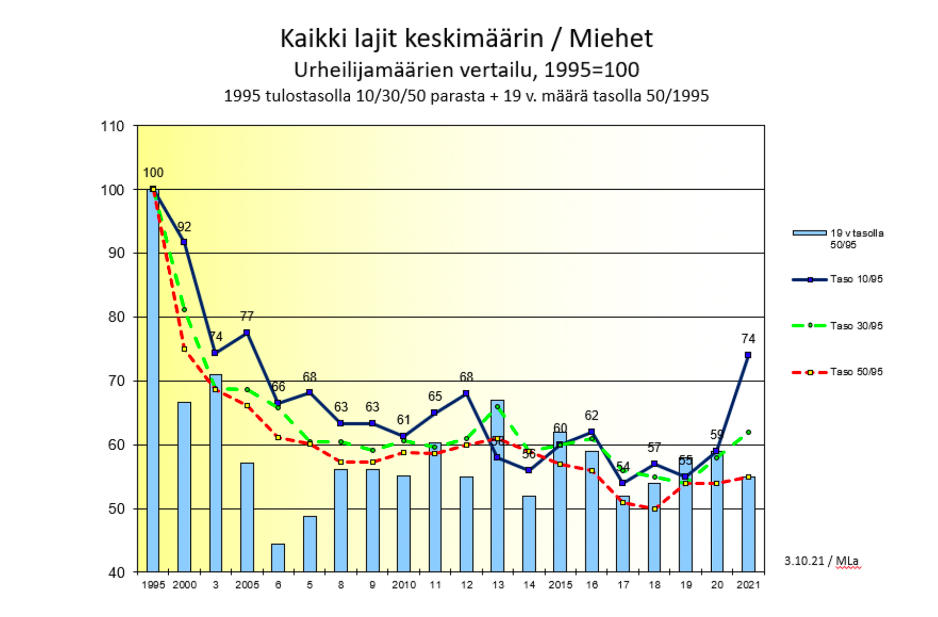 Kaikki lajit huomioon ottaen miesten yleisurheilun indeksiluvut ovat tänä vuonna kärkitason osalta 74, laajemman kansallisen tason ja junioreiden osalta 55. (Koko tilastokokonaisuus lajiryhmittäin pdf-muodossa: Tasokehitys 2021)