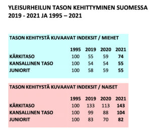 Sen sijaan naishyppääjät ovat nouseet sadan paremmalle puolelle vain vuosina 2018-2021. Tämän vuoden indeksi 116 on seurantajakson toiseksi paras. Naisjunioreiden tämän vuoden indeksi 72 edustaa keskiarvoisesti 15 viime vuoden aikana vakiintunutta tasoa.