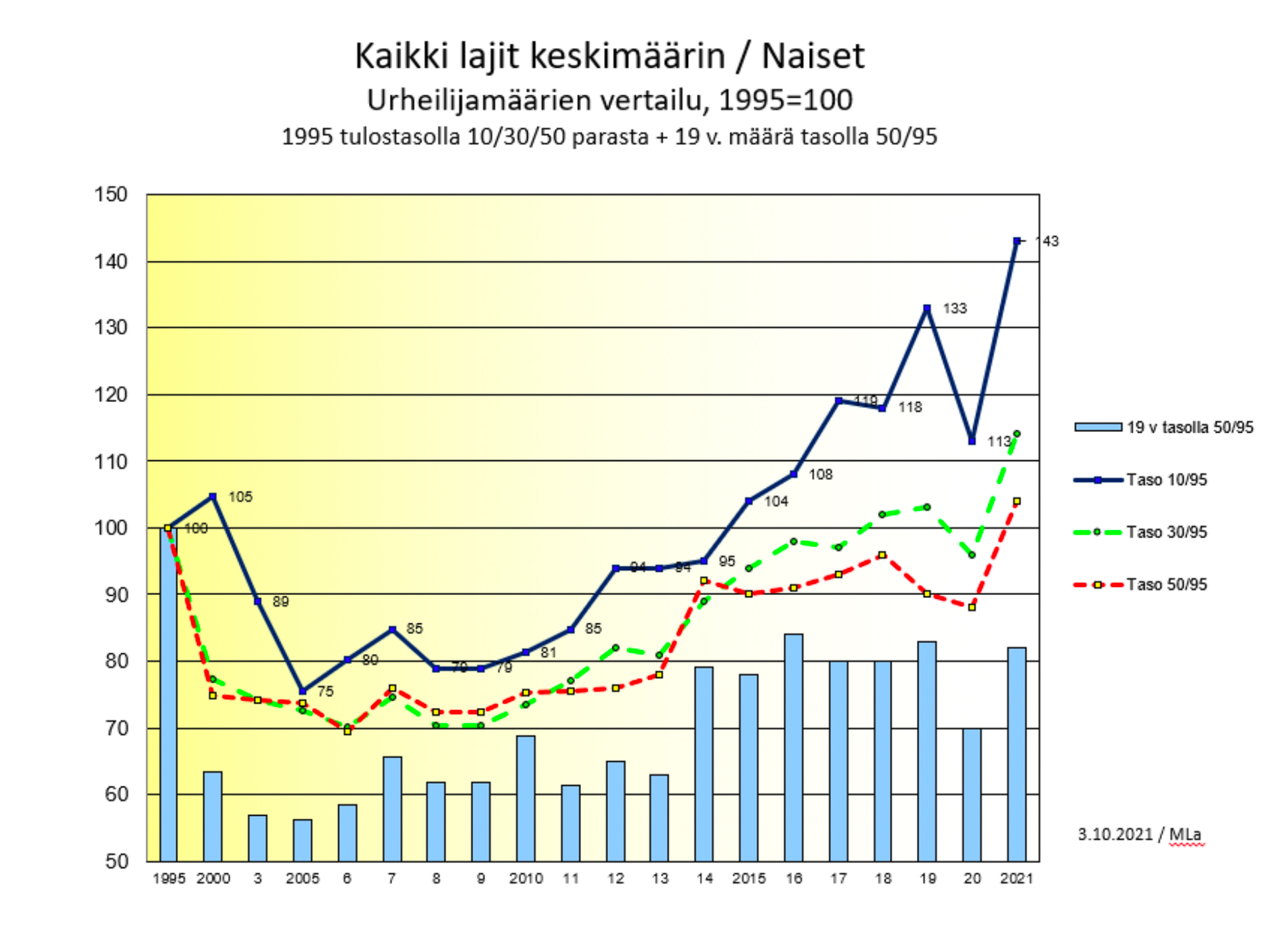 Naisten tuoreimmat tilastotulokset tuottavat indeksikertymän 143 – 104 – 82. Esimerkkinä kärkitason (10. parhaan) osalta luvut tarkoittavat sitä, että miesten lajeissa on menetetty 26 prosenttia urheilijoista siltä tulostasolta, jolla he olivat vuonna 1995. Naisten lajeissa tällä kärkitasolla on nyt peräti 43 prosenttia enemmän urheilijoita, kuin heitä oli vuonna 1995.