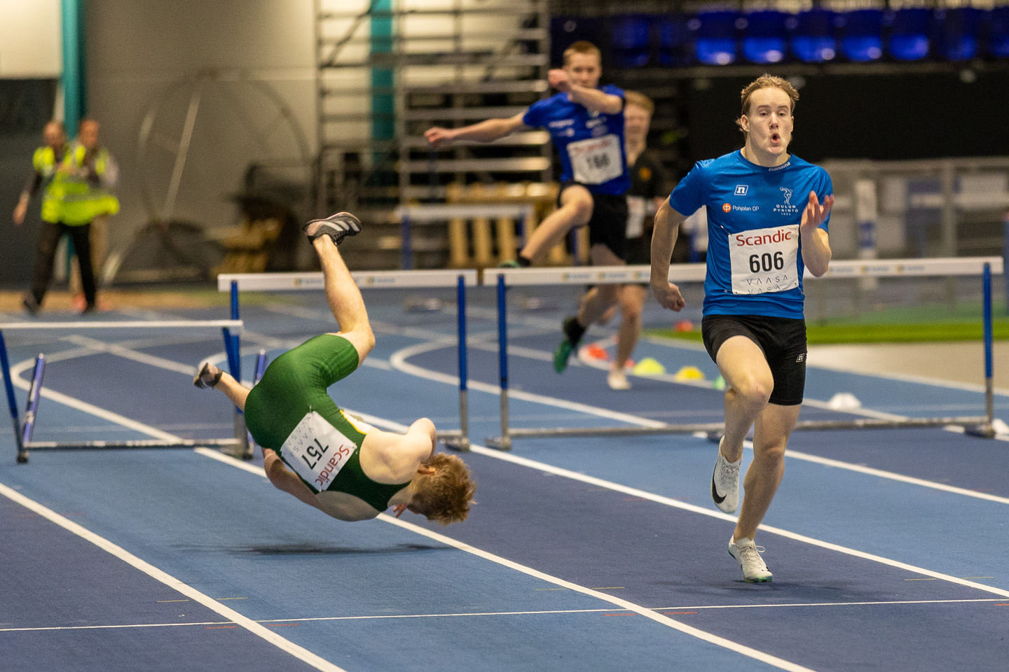 Oulun Pyrinnön Oskari Hiltunen voitti 17-vuotiaiden miesten 300 metrin aidat ajalla 39,14. Erässä oli pientä draamaa, kun Hiltusen kanssa kärkitaistossa loppusuoralle rynnistänyt Kenttäurheilijat -58:n Thomas Kleemola kaatui.