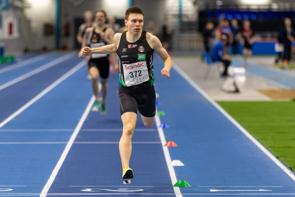 Turun Urheiluliiton mailerilupaus Sisu Saarinen oli vahvassa vedossa M17-sarjan 800 metrillä. Hän otti voiton viime kesänä ulkoratojen ennätystään sivuten ajalla 1.54,33.