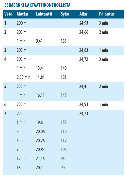 Vaihtoehtoja 3 x 5 x 200 m / 2 x 10 x 200 m / 2 x 6 x 200 mäki / 2 x 7 x 200 m. Palautukset nousevasti 1.30–2–3 min