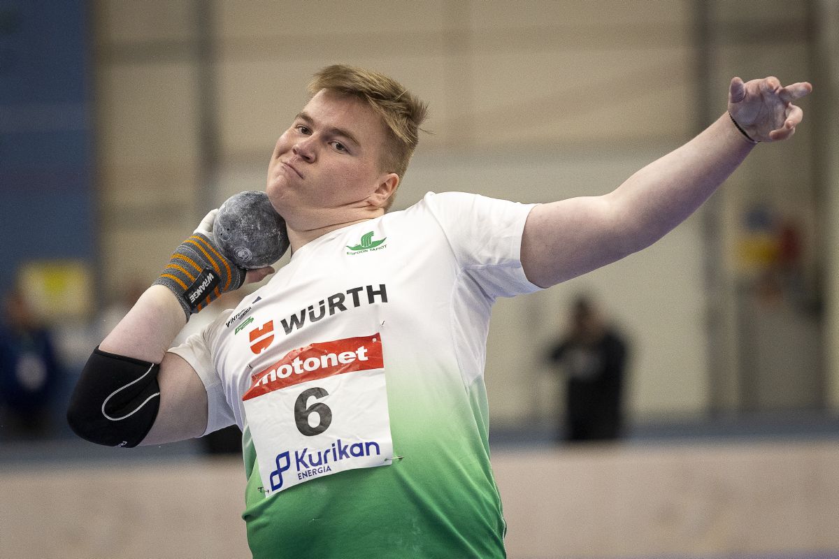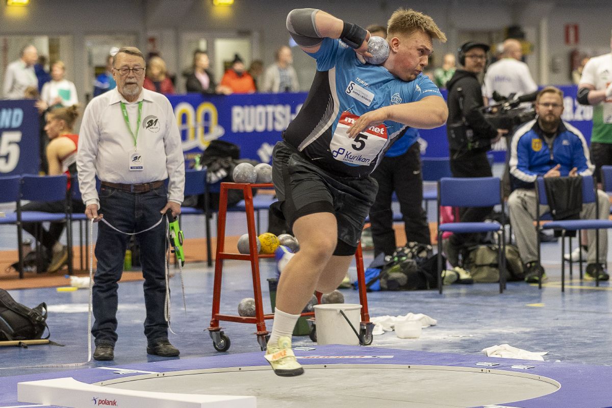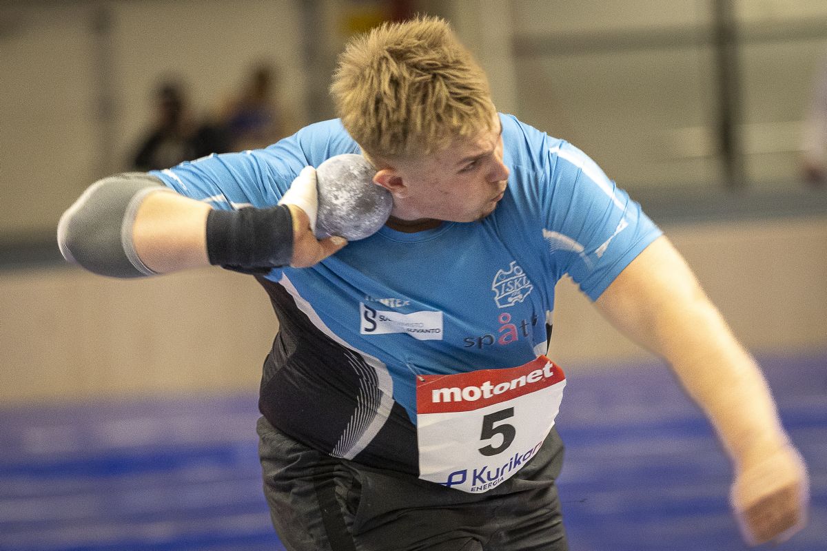 Vammalan seudun Voiman Aapo Karvinen venyi viimeisellä kierroksella tulokseen 15,58 nousten neljänneltä tilalta toiseksi. Tämä oli jo hänen kolmas peräkkäinen hallikauden hopeamitalinsa.
