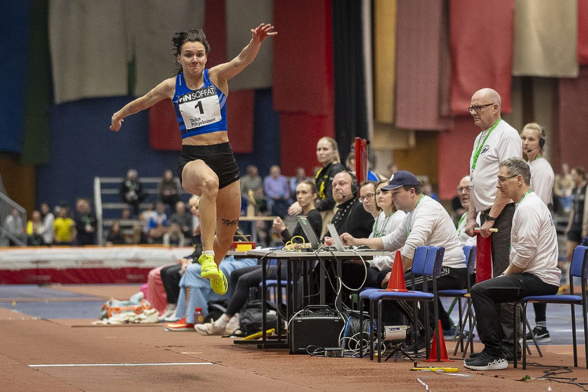 Naisten kolmiloikan hallimestariksi palasi vuosina 2020-2022 kolme peräkkäistä mestaruutta voittanut Senni Salminen. Imatran Urheilijoita edustavan Salmisen voittotulos oli 13,72. Tällä kaudella Salminen on osoittanut tasaisen varmaa kuntoa hyppäämällä aiemmin kolmessa kansainvälisessä kilpailussa kolmen parhaan joukkoon tuloksin 14,07, 13,95 ja 13,85. Kuortanehallissa hän oli ylivoimainen.