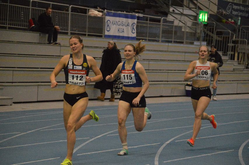 Viisiottelun 800 metrin kirikierroksella Saima Kossa, Eveliina Lehtola ja 22-vuotiaiden mestari Emmi Hietanen.