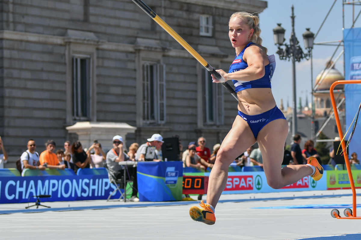 Seiväshyppääjä Saga Andersson ylitti korkeuden 430 ja pääsi yrittämään kahdesti 445:n ylitystä, ennen kuin maajoukkueiden EM-kilpailuiden seiväs- ja korkeushypyn neljän pudotuksen sääntö päätti hänen kilpailunsa.