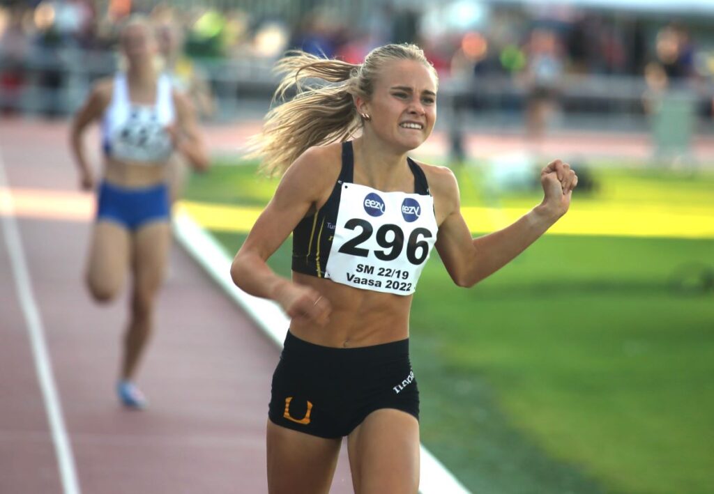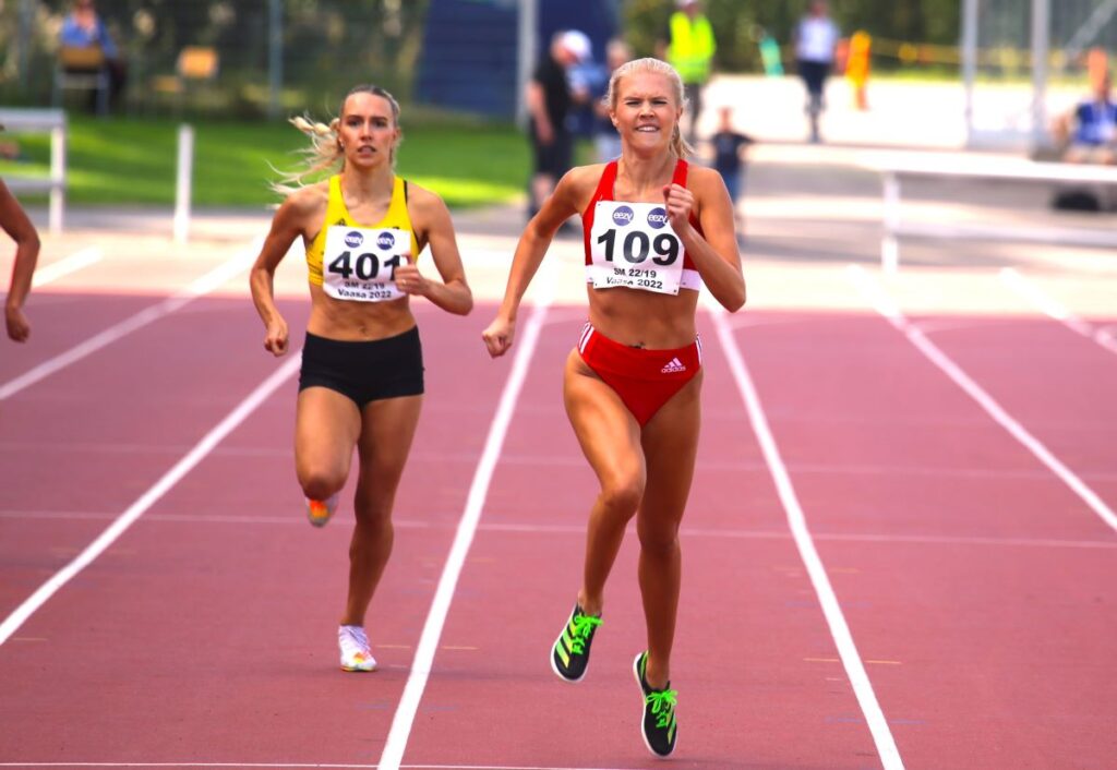 Kalevan kisojen estejuoksun voittaja Lotta-Maria Maine Turun Urheiluliitosta juoksi Vaasassa 22-vuotiaiden naisten 1500 metrin mestariksi uudella ennätyksellään 4.25,08. Entinen ennätys koheni kaksi sekuntia.