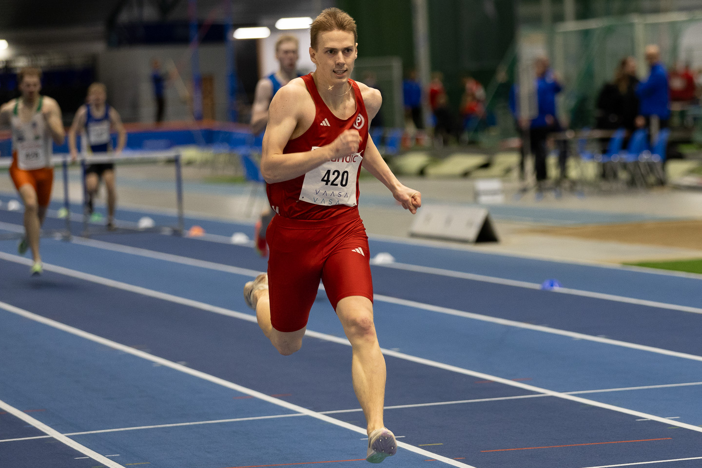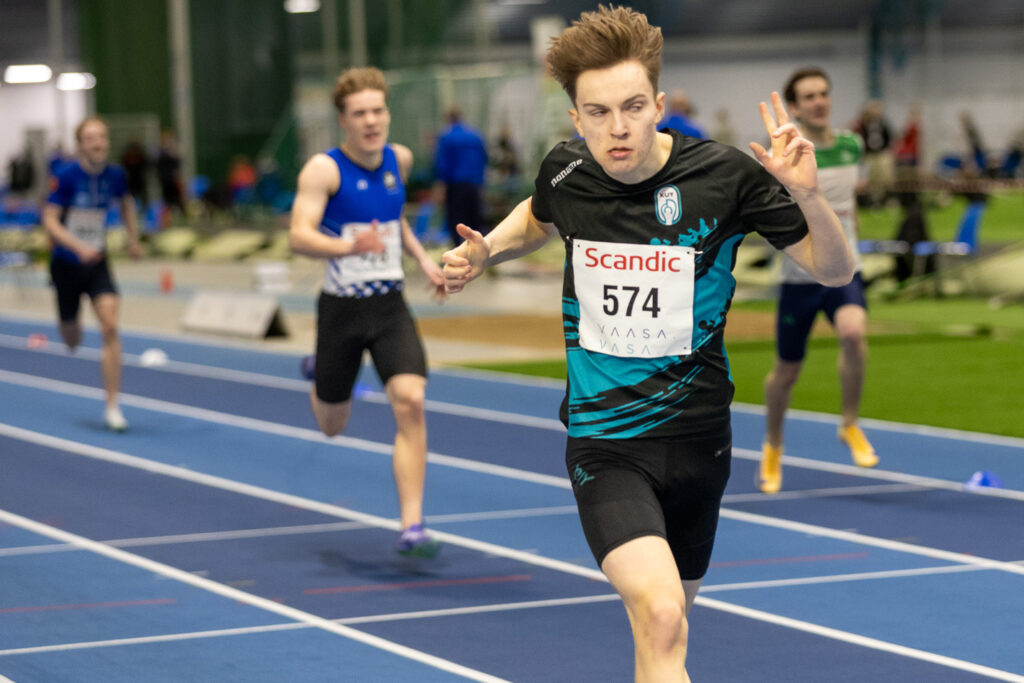 Nuutti Leppänen taitaa aitajuoksun. Perjantaina hän otti mestaruuden M19-sarjan 60 metrin aidoissa, ja sunnuntaina tuli tuplamestaruus 300 metrin aidoissa hyvällä ajalla 37,57. Ennätys parani roimasti ajasta 39,08.