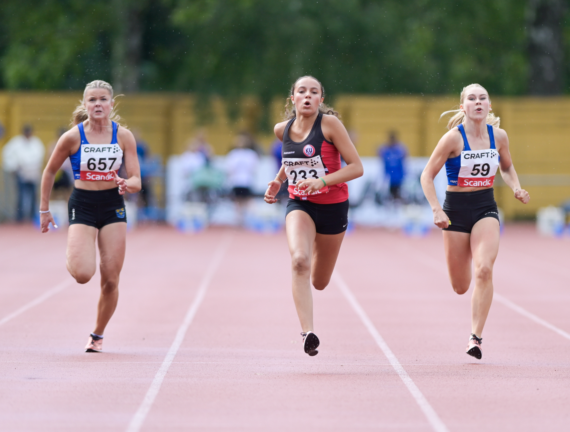 Karhulan Urheilijoiden Oona Figueira kiiti 15-vuotiaiden tyttöjen 100 metrin suvereeniksi mestariksi ajalla 12,42. Toiseksi pinkoi Gamlakarleby IF:n Ines Piispanen ajalla 12,78.