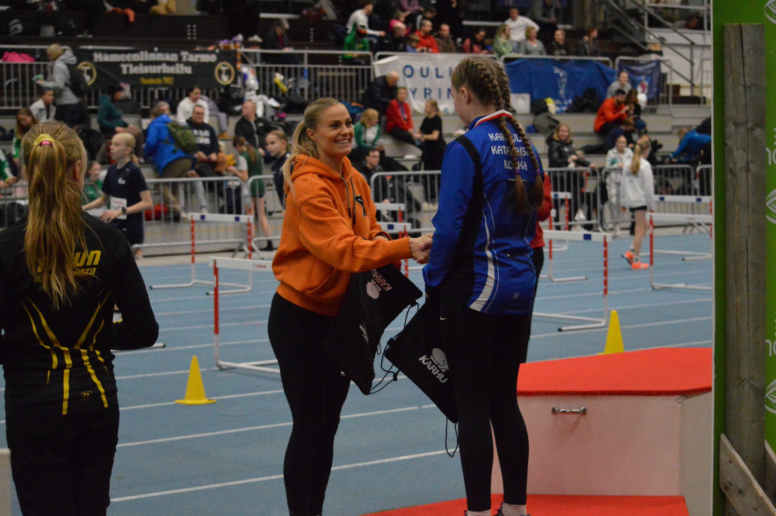 Tampereen Pyrinnön huippuaituri Lotta Harala jakoi mitaleita ja seurasi tarkasti aitajuoksuviestejä.