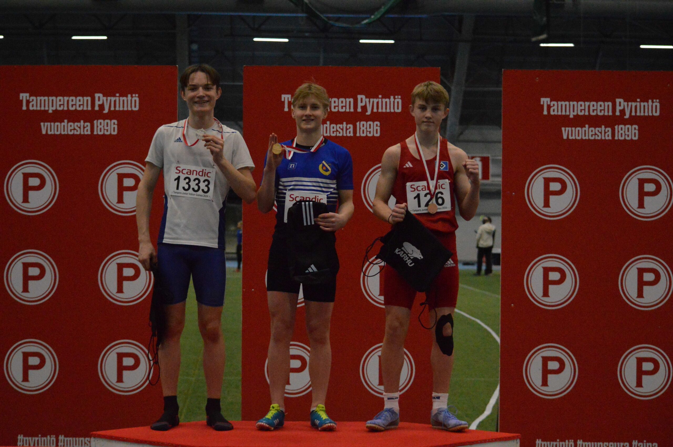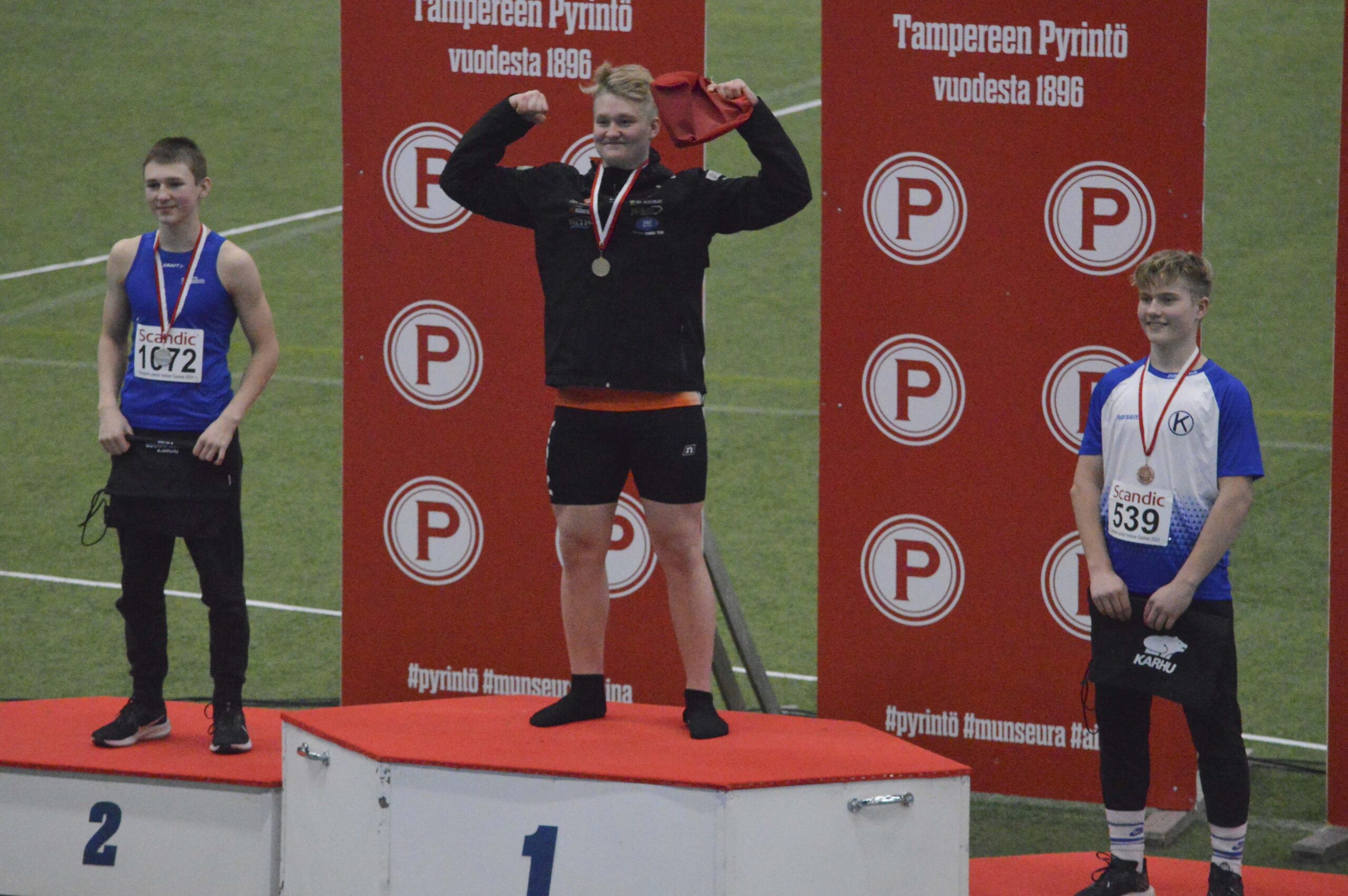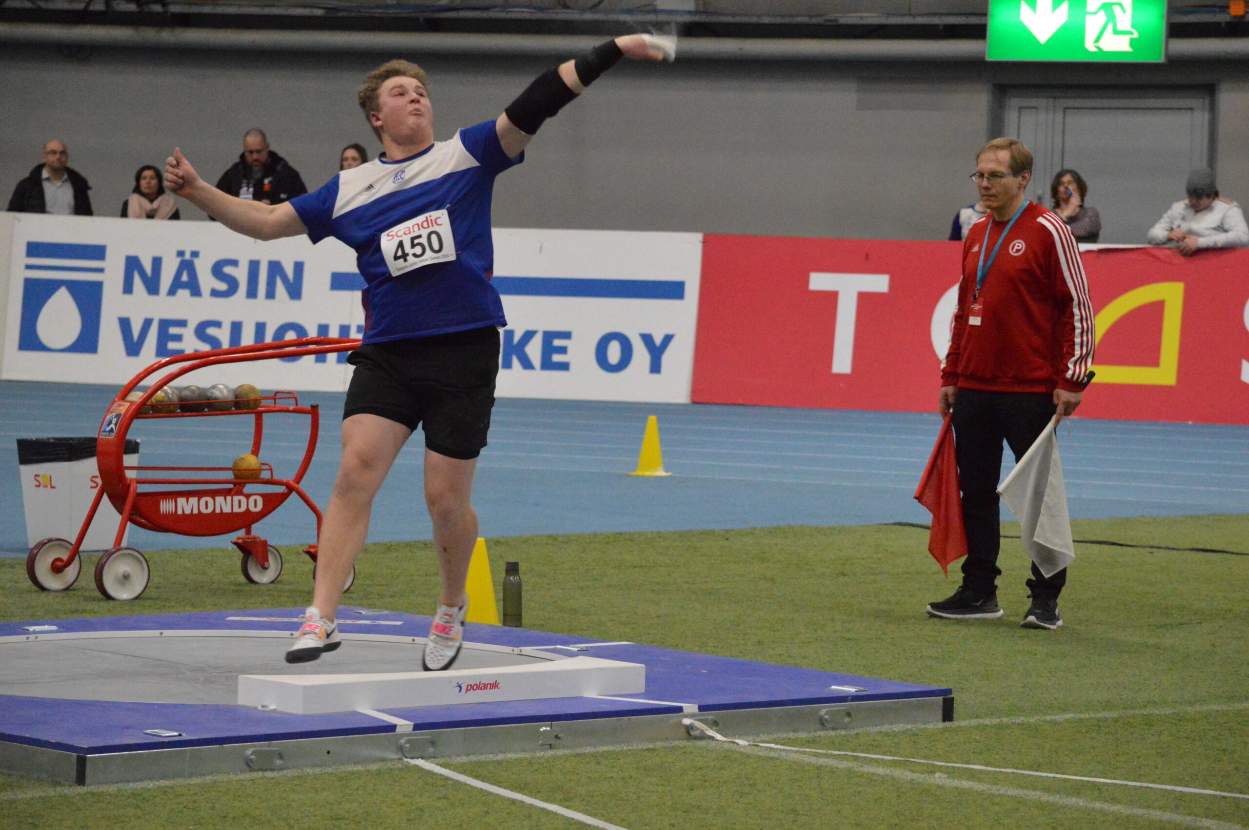 Jyväskylän Kenttäurheilijain Valtteri Paksuniemi voitti 17-vuotiaiden poikien kuulantyönnön hallikauden parhaalla tuloksellaan 16,37. Hän pyörähti tuloksen heti ensimmäisellä kierroksella. Paksuniemi astui muut viisi työntöään yli. Toiseksi sijoittui Himangan Urheilijoiden Niilo Torvi tuloksella 15,62. Paksuniemi harmitteli tekniikkavirhettä.