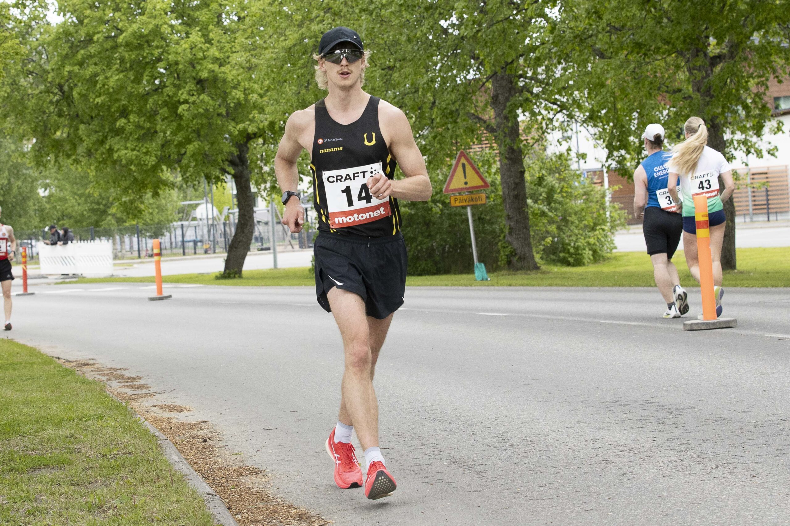 Turun Urheiluliiton Jerry Jokinen voitti ylivoimaisesti uransa ensimmäisen maantiekävelyn Suomen mestaruuden sunnuntaina. Jokinen ylitti 20 kilometrin kävelyn maaliviivan Saarijärven keskustaan vedetyllä reitillä ajassa 1.26.21.
