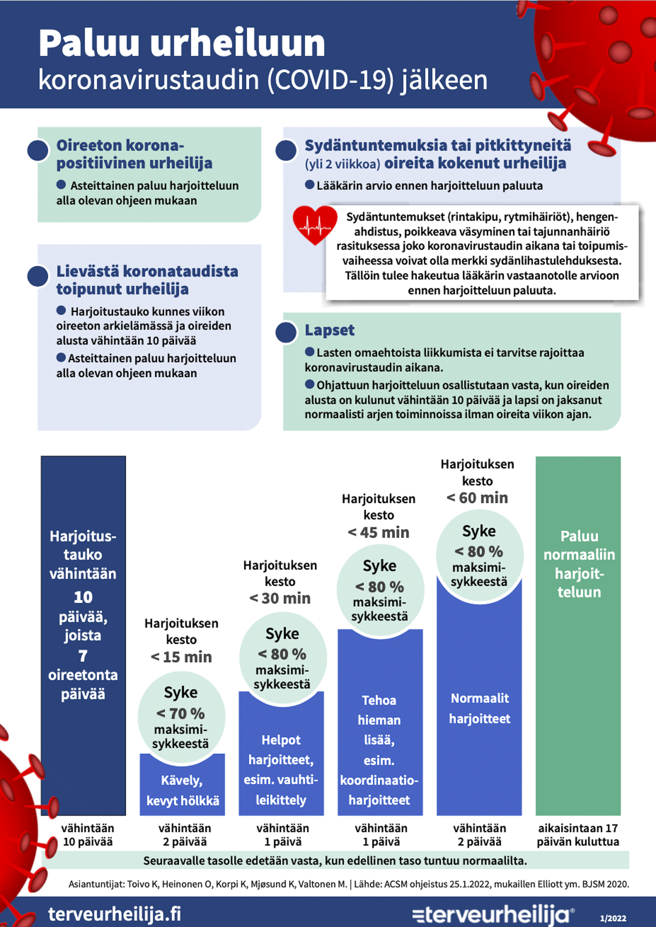 Katso terveurheilija.fi -sivun päivitetyt suositukset paluusta harjoittelemaan ja urheilemaan koronavirustaudin jälkeen. Asiantuntijatyöryhmän laatimat suositukset korostavat asteittaista paluuta harjoitteluun.