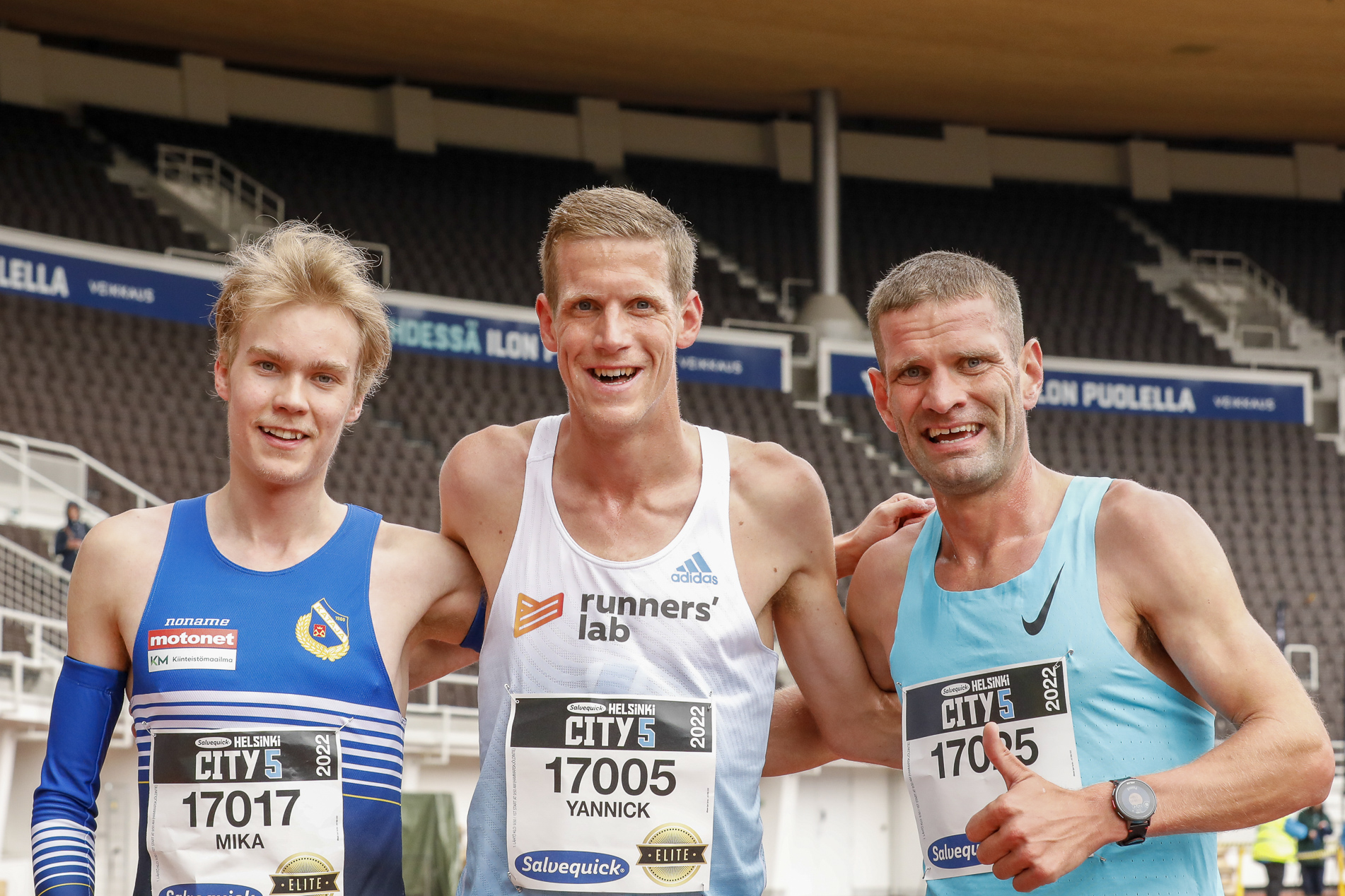 Helsinki City 5 -juoksun kärkitrio: Kolmanneksi juossut Mika Kotiranta, voittaja Yannick Michiels ja toiseksi sijoittunut Tiidrek Nurme.
