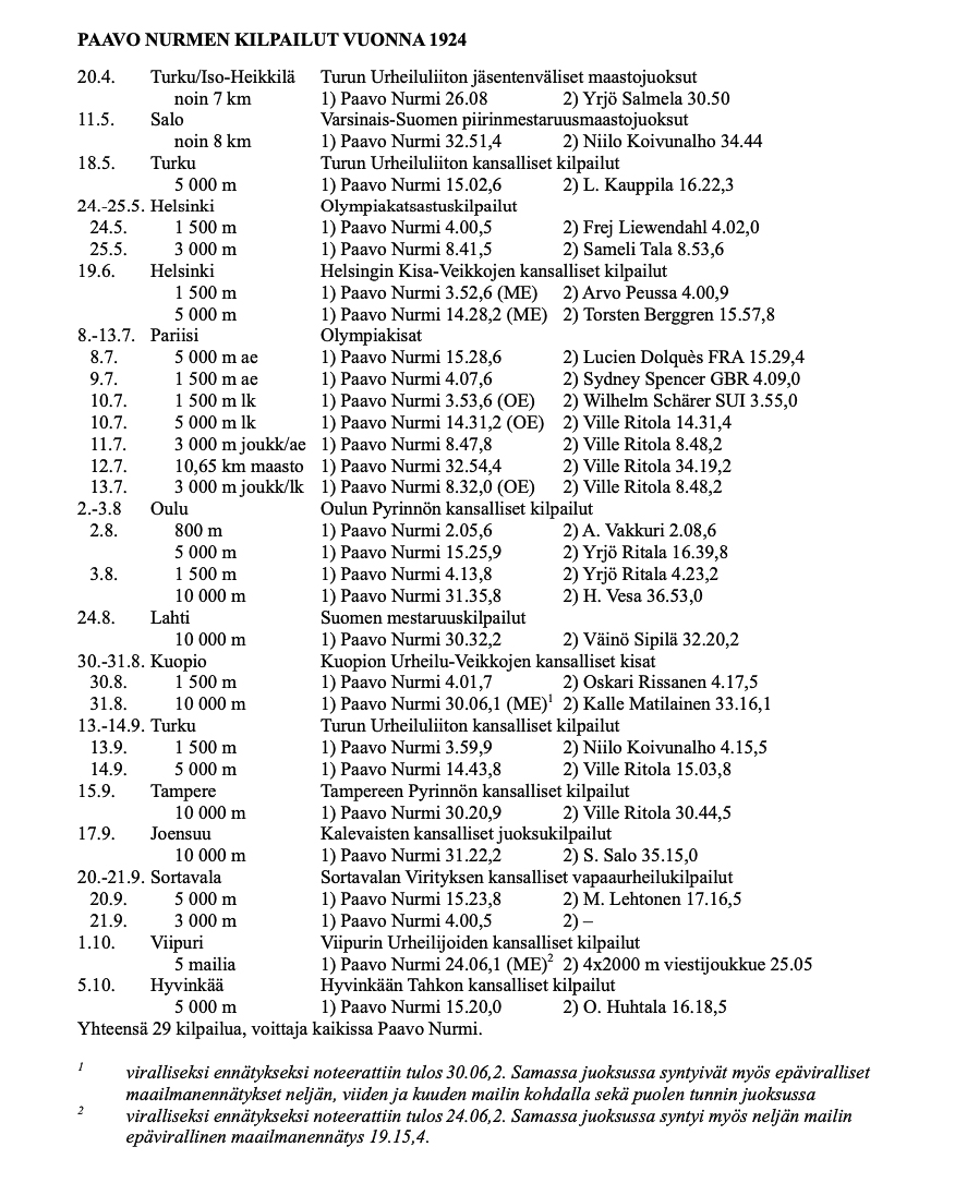 Paavo Nurmen urheilusaavutukset vuodelta 1924 hakevat vertaistaan yleisurheilun historiassa. Hän osallistui tuolloin 29 kilpailuun voittaen ne kaikki. Häntä ei pysäyttänyt edes Pariisin olympiakisoihin laadittu aikataulu, jossa kaksi hänen vahvinta juoksumatkaansa (1 500 ja 5 000 metriä) oli laitettu noin tunnin aikaerolla samalle päivälle.