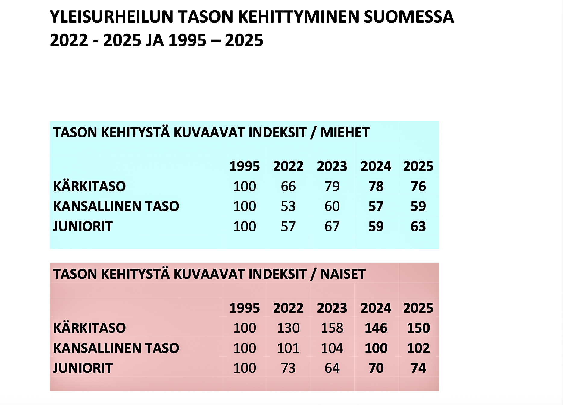 Kun tarkastellaan kuluvan vuosikymmenen trendejä, on myönteistä, että kokonaisuutena niin yleisen sarjan miesten kuin miesjunioreidenkin indeksit jatkavat sitä noususuuntaa, joka käynnistyi vuosien 2017 ja 2018 pohjakosketusten jälkeen.