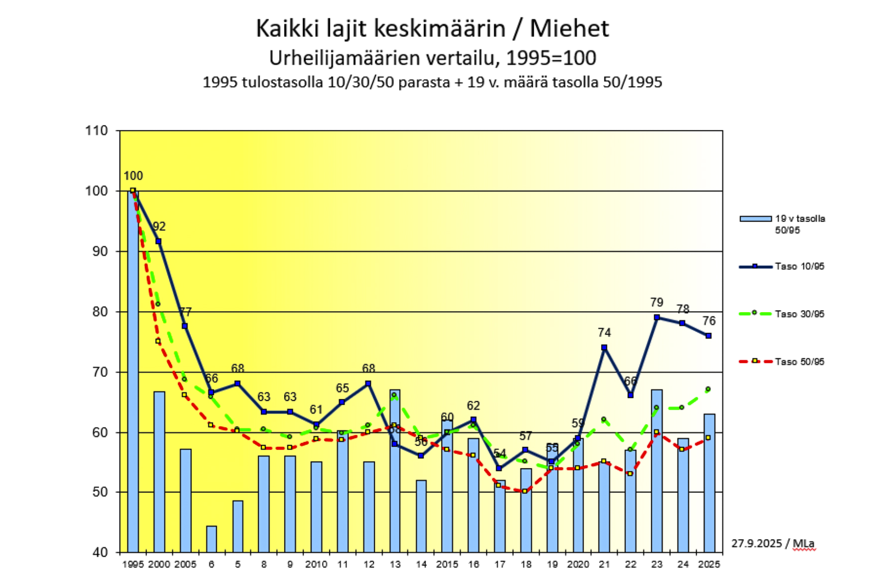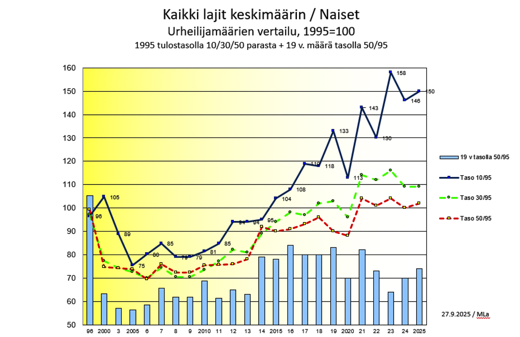 Lajien kymmenen parhaan tuloksen osalta luvut tarkoittavat, että miesten lajeissa on menetetty neljäsosa urheilijoista siltä tulostasolta, jolla oltiin vuonna 1995. Naisten lajeissa kärkitasolla on nyt puolitoista kertaa enemmän urheilijoita kuin mitä heitä oli vuonna 1995.
