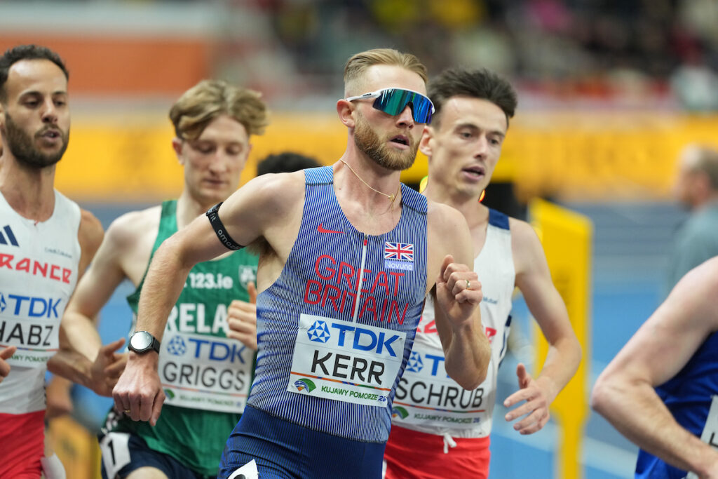 Skotlantilainen Josh Kerr lähti vastustamattomaan kiriin viimeistäedellisellä kierroksella ja uusi miesten 3000 metrin toissatalvisen maailmanmestaruutensa ajalla 7.35,56.