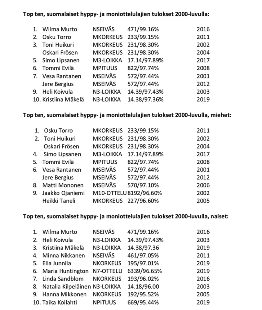 Jonkin verran ennen uuden vuosituhannen juhlia suomalaiset hyppääjät ja moniottelijat tekivät muutaman kovan tuloksen. Ateenan MM-kilpailuissa 1997 Eduard Hämäläinen vahvisti MM-hopeansa Suomen ennätyspistein 8730, joka tuottaisi tähän tarkasteluun huiman vertailuprosentin 102,95. Vuotta ennen tämän seurannan käynnistymistä 2.8.2000 Johan Meriluoto loikkasi nykyisessä kotikaupungissaan Turussa ennätyksensä 16,95, jonka vertailuprosentti 96,80 oikeuttaisi miesten kärkikymmenikköön.