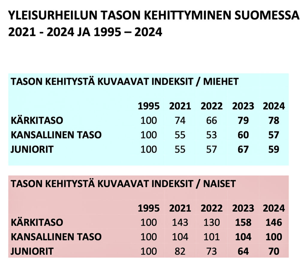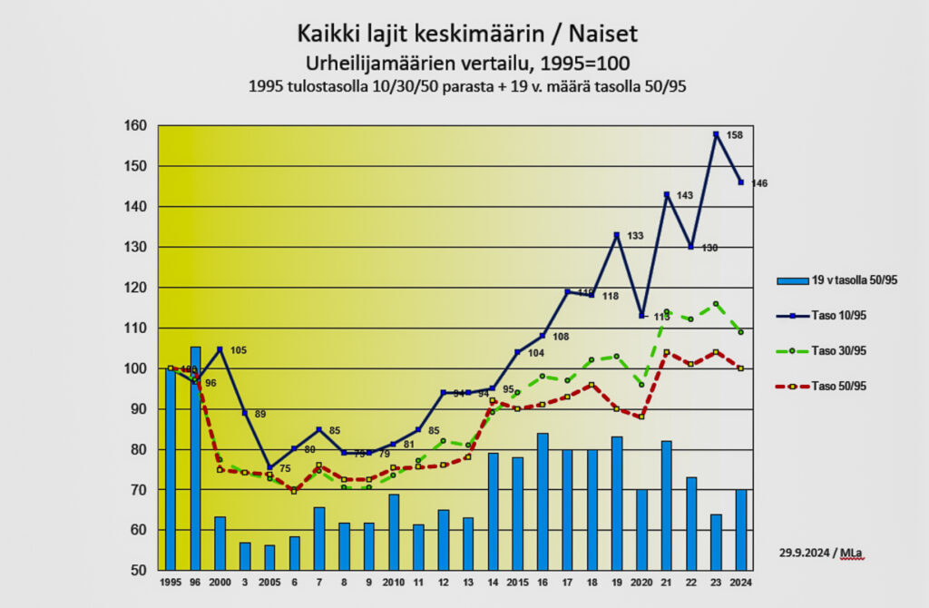 Naisten tuoreimmat tilastotulokset tuottavat vastaavan indeksikertymän 146-100-70. Lajien kymmenen parhaan tuloksen osalta luvut tarkoittavat sitä, että miesten lajeissa on menetetty viidesosa urheilijoista tulostasolta, jolla he olivat vuonna 1995.
