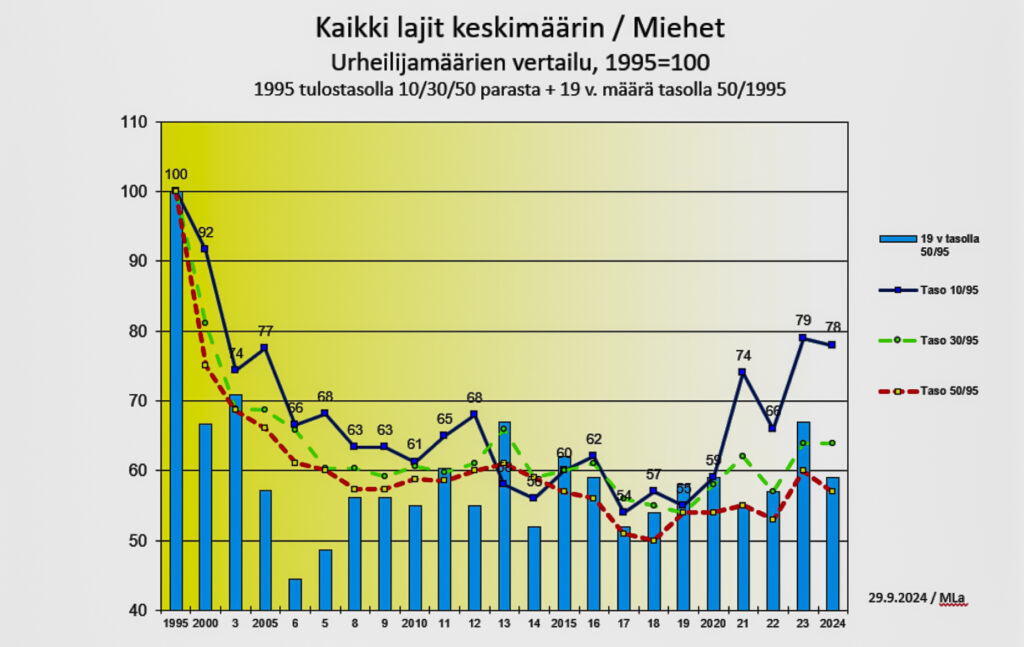 Vaikka mieshyppääjien kärkitason indeksi nousi viime vuoden 54:stä 61:een ja kansallisen tason indeksit pitivät koko lailla tasonsa, on lajiryhmän pidempi näkymä lohduton. Miesjunioreiden indeksi jatkoi laskuaan. Se oli nyt koko seurantajakson alhaisin, enää 36.