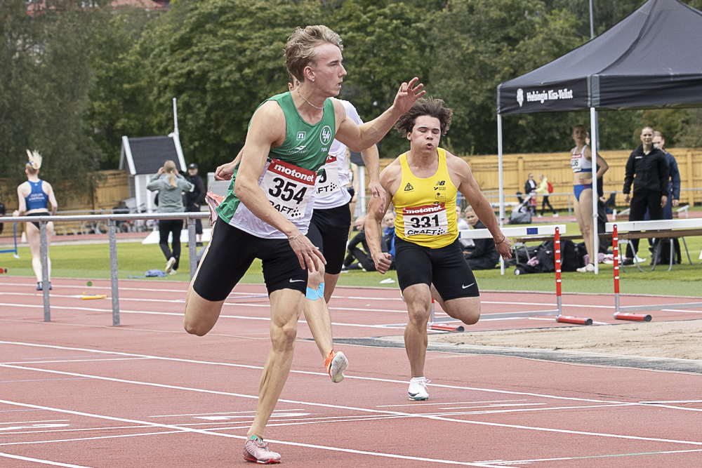 Juho Venäläinen voitti 19-vuotiaiden miesten 100 metriä ajalla 10,63. Se oli Venäläiselle kisojen toinen mestaruus. Hän juoksi perjantaina ikäluokkansa 400 metrin Suomen ennätyksen 46,20. Lauantain 100 metrin finaali juostiin täysin tyveneen.