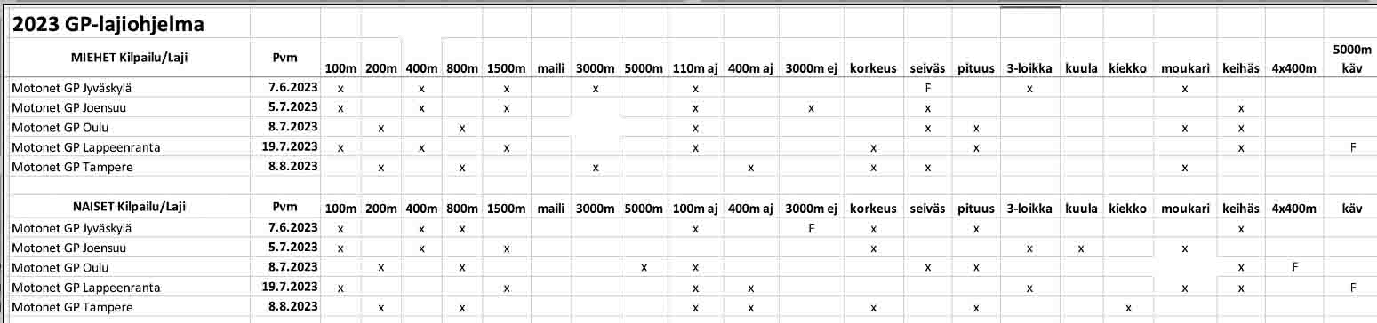 Motonet GP:n lajikattaus on viime vuosien tapaan laaja. Suosituimpia lajeja ovat miesten ja naisten osalta hieman vaihdellen 100 metriä, pika-aidat, 800 ja 1500 metriä, korkeus, pituus, moukari ja keihäs.
