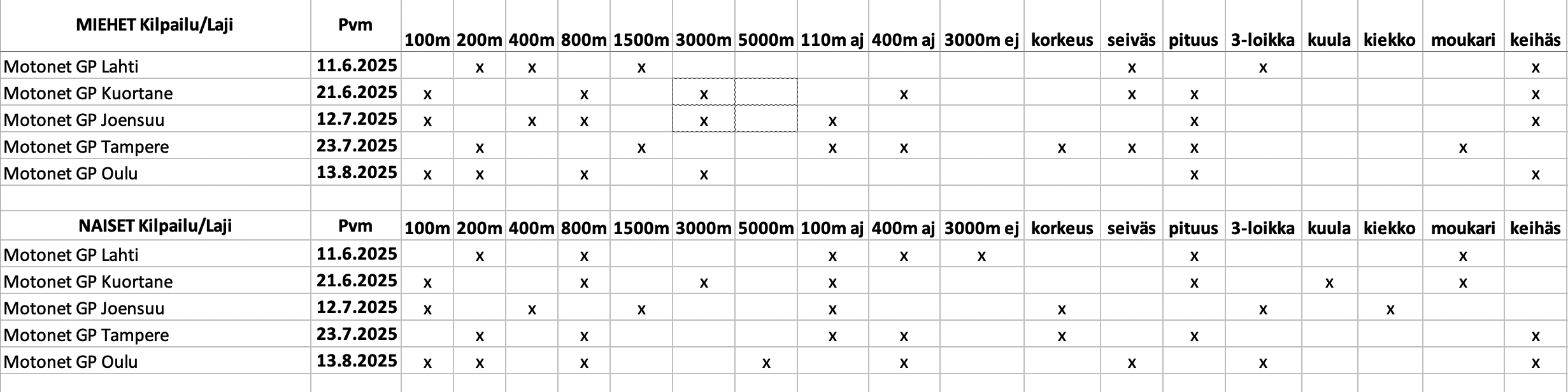 – GP-kisojen konseptia uudistetaan ensi kesänä niin, että varsinainen kilpailu kestää kaksi tuntia ja 45 minuuttia. Sen puitteissa käydään läpi kaikki A-erät, suorat finaalit ja 100 metrin ja pika-aitojen alkuerät, kertoo Motonet GP:n kisajärjestäjien koordinaattorina toimiva Tuomo Lehtinen.