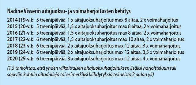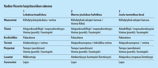 – Suurin ero perusviikoissa kauden edetessä on, miten toimintaan maanantaina, torstaina ja lauantaina, Bennema sanoo. (vrt. taulukko ”Nadine Visserin harjoitusviikon rakenne harjoitusvuoden aikana”).