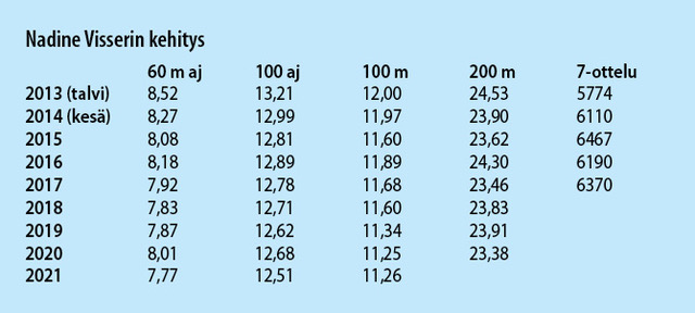 – Se on asia, jossa Visserin kanssa pitää olla tarkkana. Hänellä oli moniotteluvuosinaan säären rasitusmurtuma ja penikkatautiongelmia. Moniottelijana hänellä on pohjaa kimmoharjoittelusta ja aitajuoksuharjoituksissa tulee paljon hyppyjä. Lisäksi maanantaina on verryttelyssä kevyitä hyppyjä laatikon päälle ja torstaisin aitahyppyjä treenin päätteeksi, Bennema sanoo.