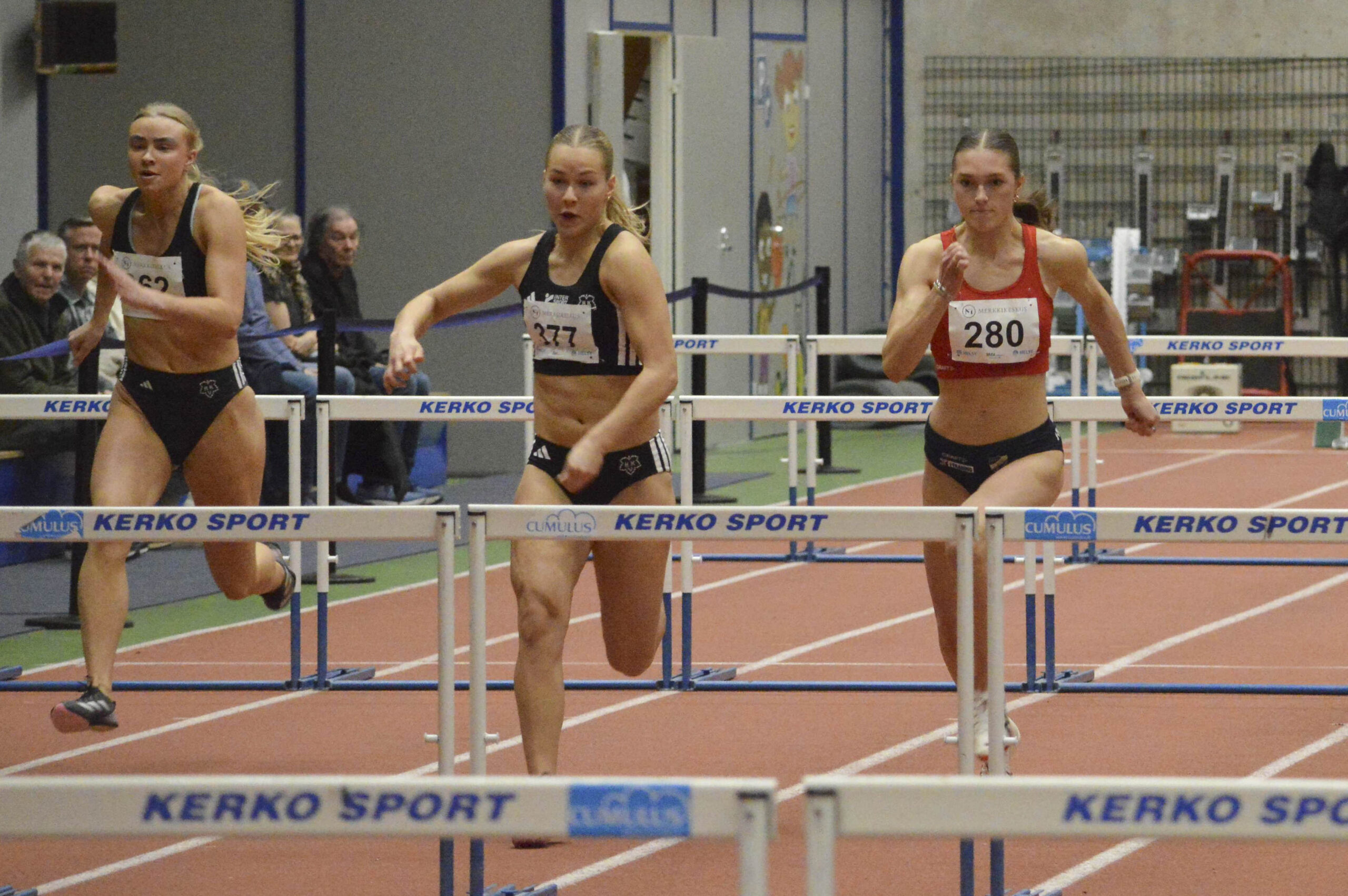 Helsingin Kisa-Veikkojen Siiri Siirtola voitti naisten 60 metrin aitajuoksun ennätyksellään 8,31.