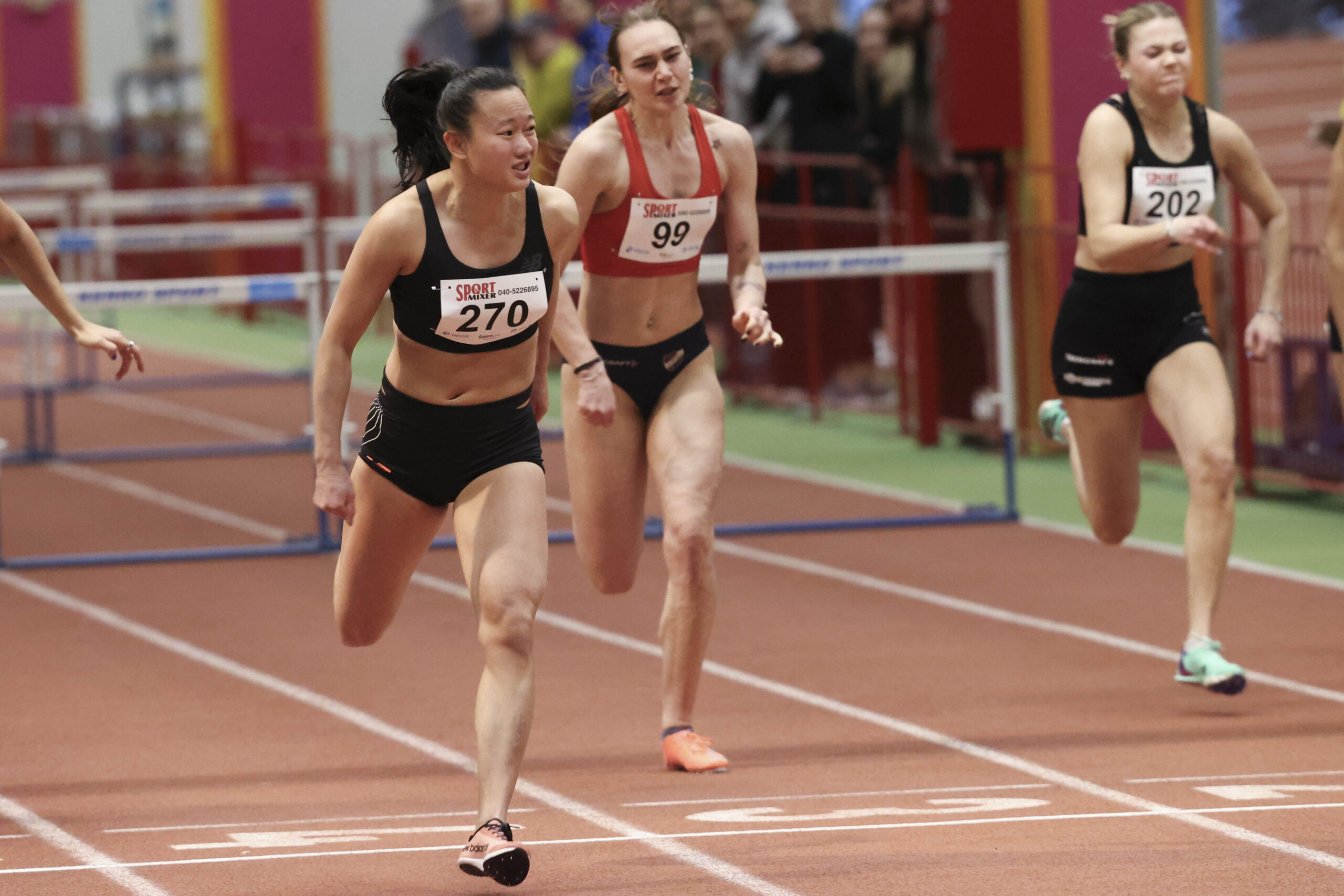 Naisten 60 metrin aitajuoksun Helsingissä voitti Espoon Tapioiden Saara Keskitalo ajalla 8,23, joka jää vain sekunnin sadasosan hänen aiemmin tänä talvena syntyneestä ennätyksestään.
