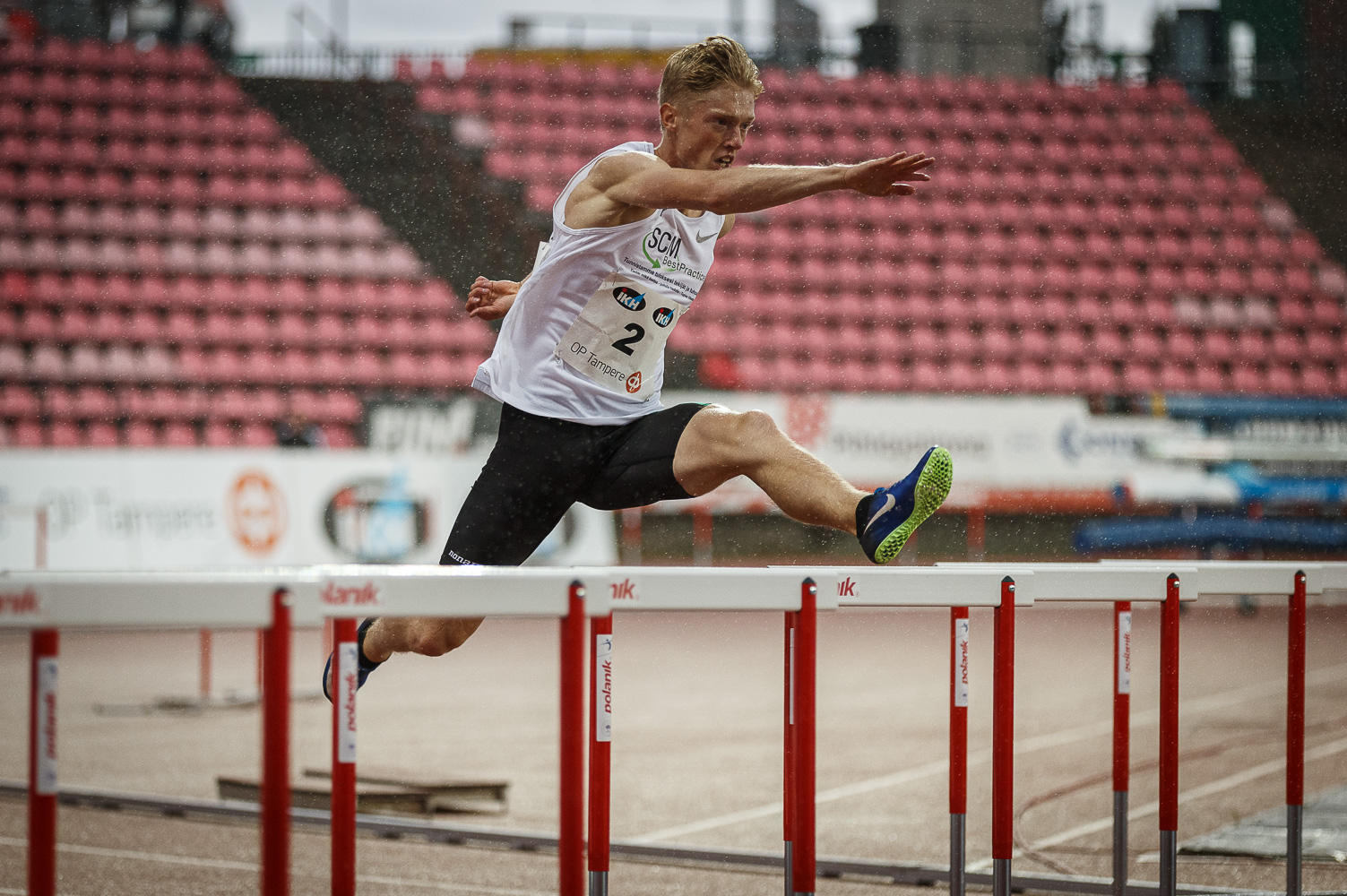 Porvoon Akilleksen Jonni Blomqvist voitti 400 metrin aitajuoksun ennätyksellään 51,44. Koleassa säässä ja sateen keskellä juostussa kilpailussa Blomqvist lohkaisi aiemmin tänä vuonna juoksemastaan ennätyksestä 0,48 sekuntia.