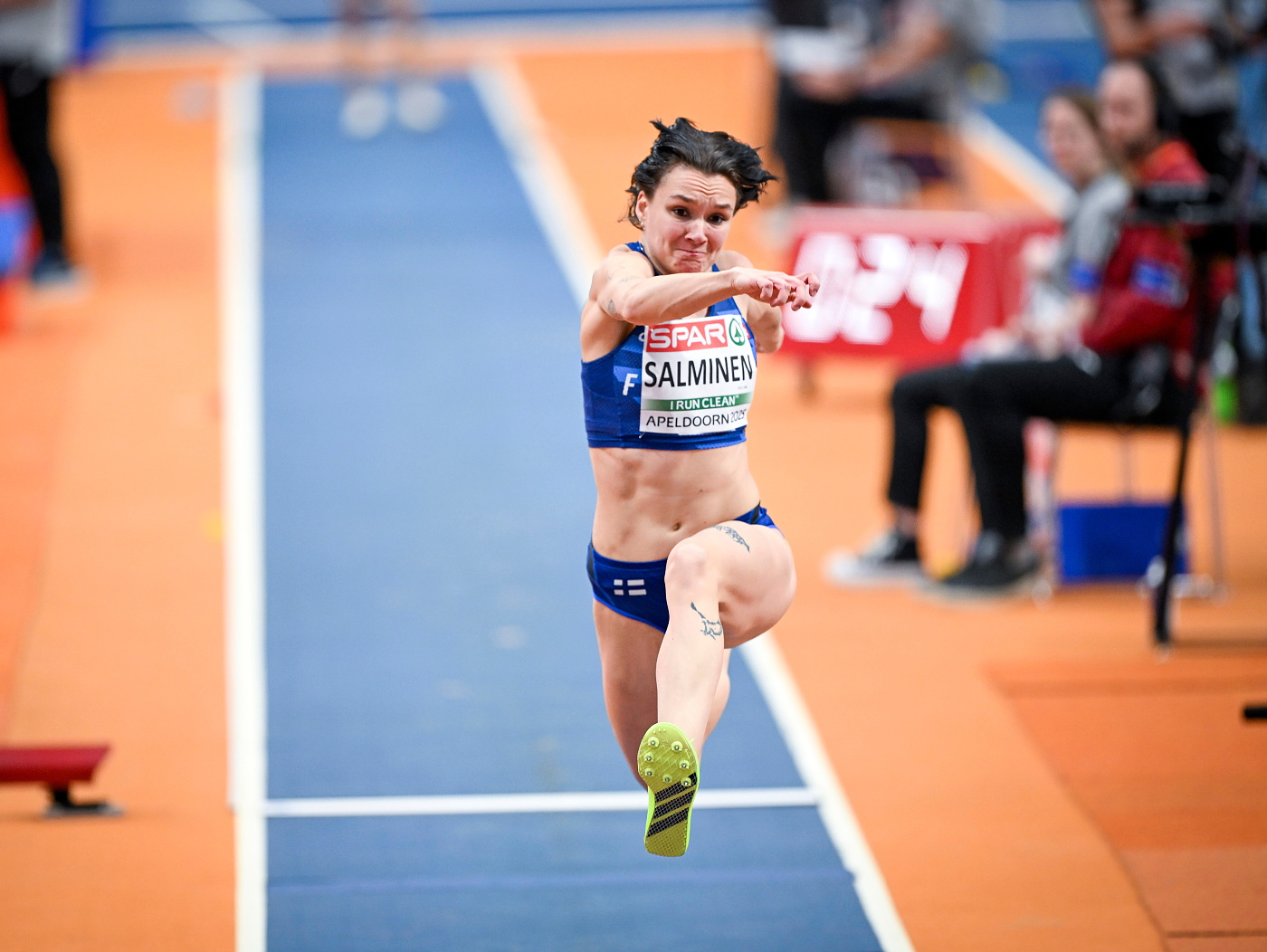 Senni Salminen avasi Suomen joukkueen mitalitilin kolmannella sijallaan naisten kolmiloikan finaalissa yleisurheilun Euroopan mestaruuskisoissa Hollannin Apeldoornissa. Salmisen loikki toisellaan 13,64 ja astui sitten seuraavat hypyt yli, kunnes viimeinen kantoi 13,99 ja toi mitalin.