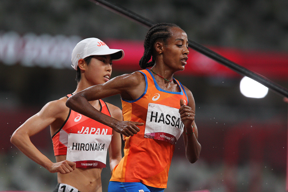 Tiistai-iltana 5000 metrin finaalissa Hassan kiri hitaan alkuvauhdin jälkeen ylivoimaisesti olympiavoittajaksi ajalla 14.36,79. Kaksi viimeisintä tämän matkan maailmanmestaruutta voittanut Kenian Hellen Obiri hävisi Hassanille 1,55 sekuntia.