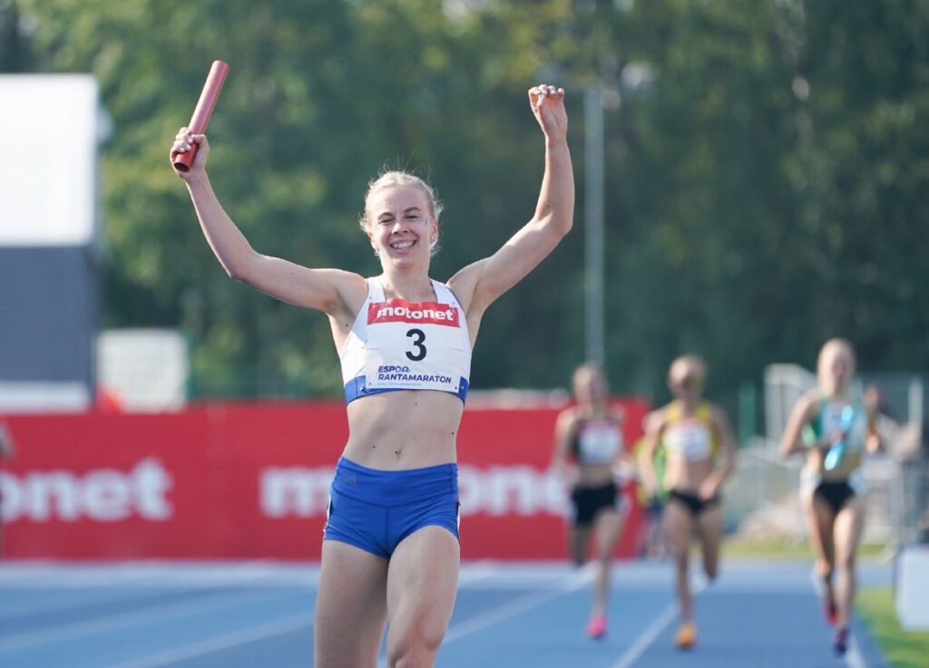 Milja Thureson toi Lahden Ahkeralle 4 x 400 metrin mestaruuden, vaikka JKU:n Aino Pulkkinen vaani takana.