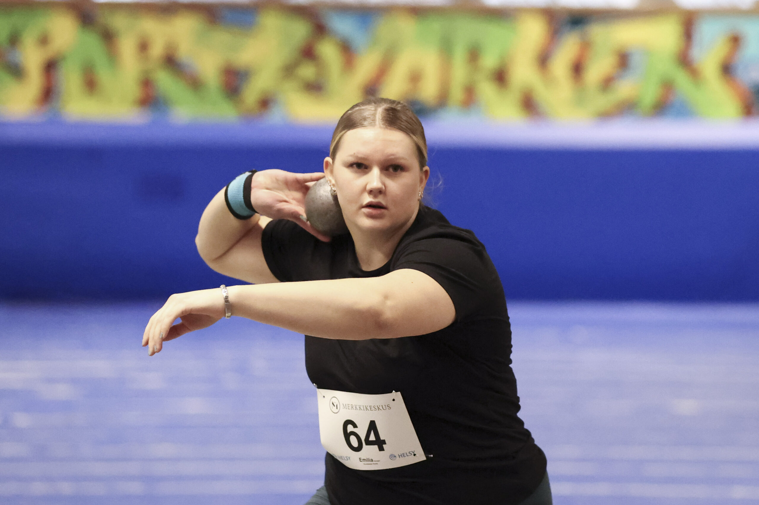 Naisten kuulassa Kuortaneen Kunnon Emilia Kangas on parannellut talven aikana tulostaan kisa kisalta: 16,80, 17,01, 17,11 ja 17.26.