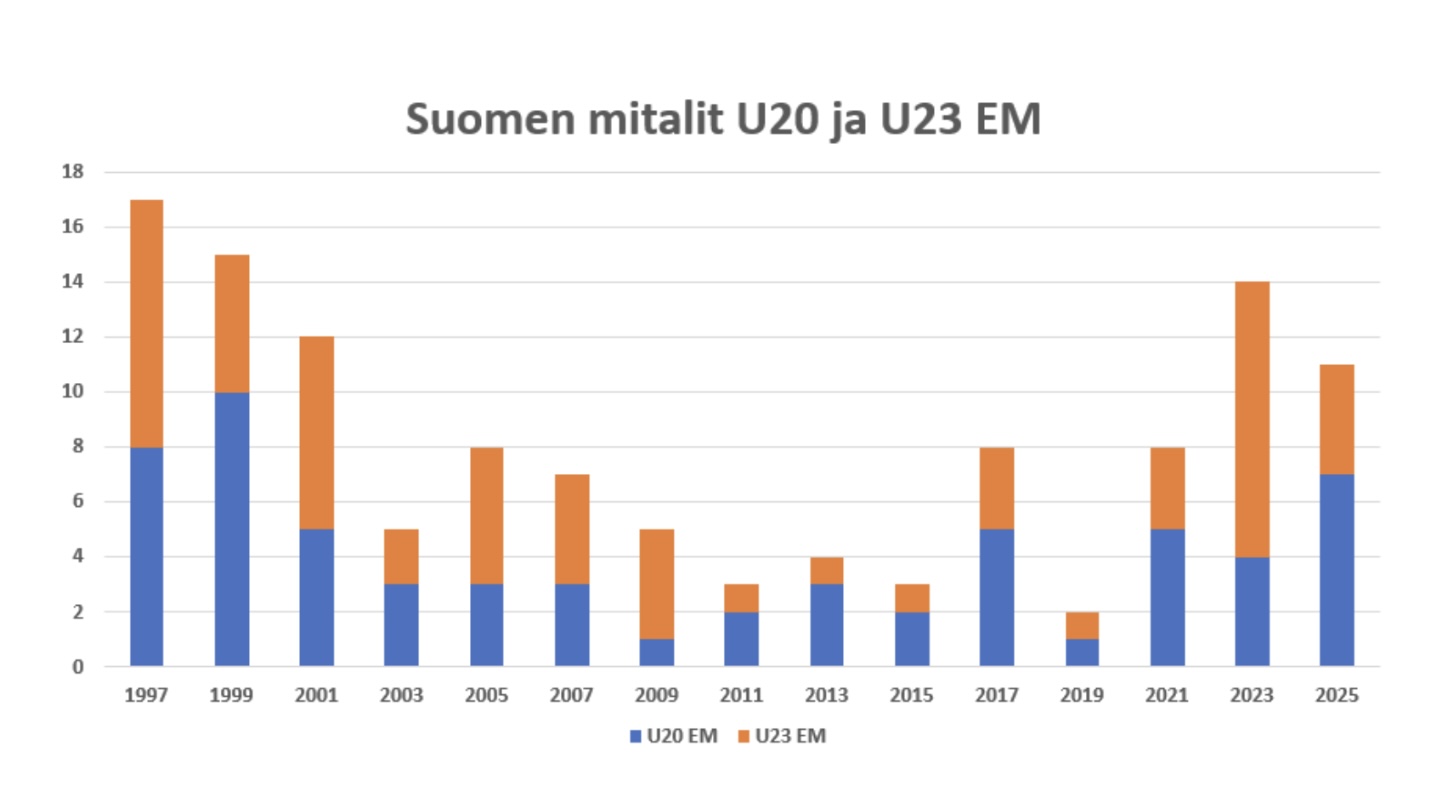 Suomi on menestynyt ”aina” erittäin hyvin oikeastaan kaikissa nuorten arvokilpailuformaateissa. Pisimpään järjestettyjen U20 EM-kisojen kaikkien aikojen mitalitilastossa Suomi komeilee 99 mitalillaan (28+36+35) sijalla 14. U23 sarjan EM-kilpailuiden mitalitaulukossa Suomen sijoitus on 13., mitaleiden yhteismäärän ollessa Bergenin kisojen jälkeen 58 (13+18+27).