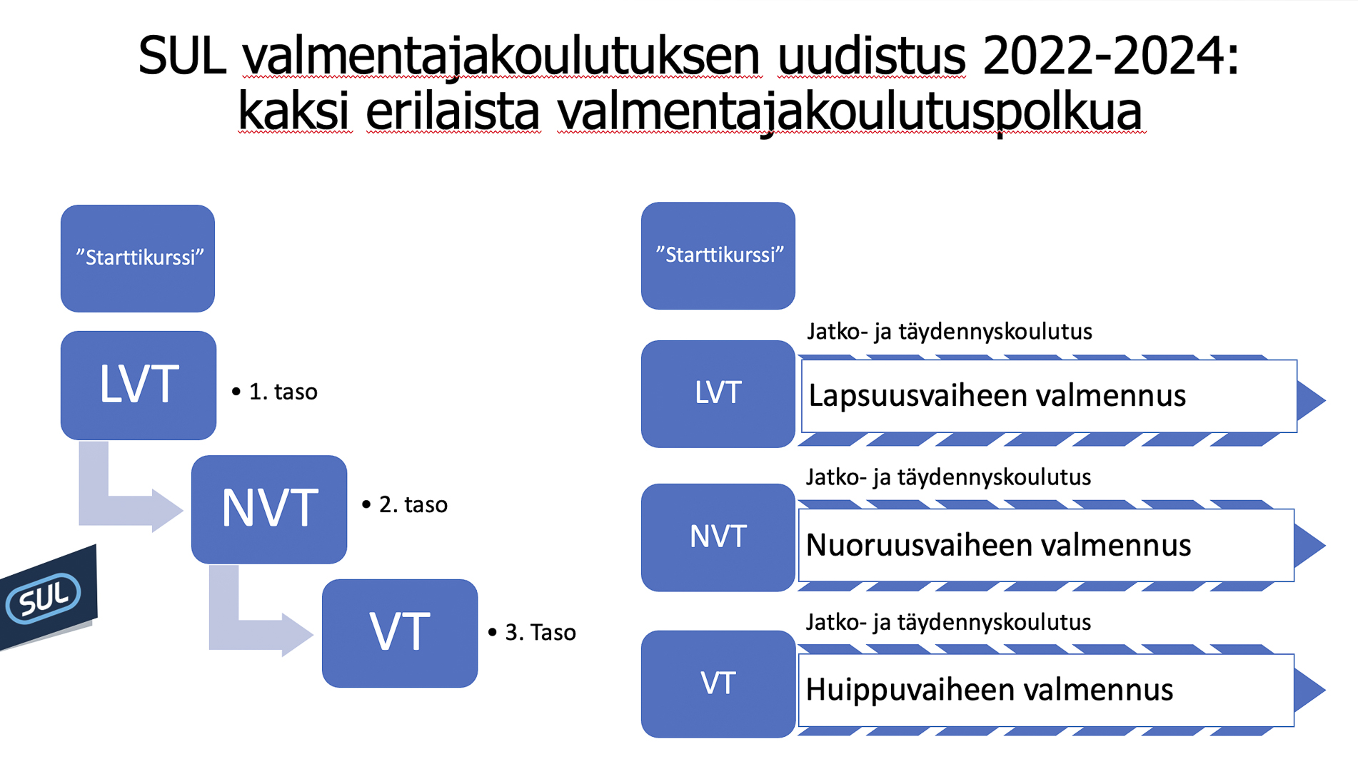 Vuosien 2022-2024 aikana tehtävässä valmentajakoulutuksen uudistuksessa selkeytämme kuitenkin koulutuspolun kokonaisuutta ja tukevoitamme erityisesti lasten valmentajien peruskoulutusta. Uudistuksen myötä valmentajakoulutuksen ykköstaso muuttuu Lasten valmentajatutkinnoksi (LVT). Kakkostaso säilyy Nuorisovalmentajatutkintona (NVT) ja kolmostaso Valmentajatutkintona (VT), mutta niiden sisältöihin, painotuksiin ja tutkintorakenteeseen tehdään muutoksia ja päivityksiä. Perustutkintojen lisäksi uudistus koskee matalankynnyksen koulutusta, mikä ainakin toistaiseksi kulkee työnimellä ”Starttikurssi”. Se on suunniteltu ja rakennettu erityisesti seurojen käyttöön aloittelevien uusien ohjaajien kouluttamiseksi.